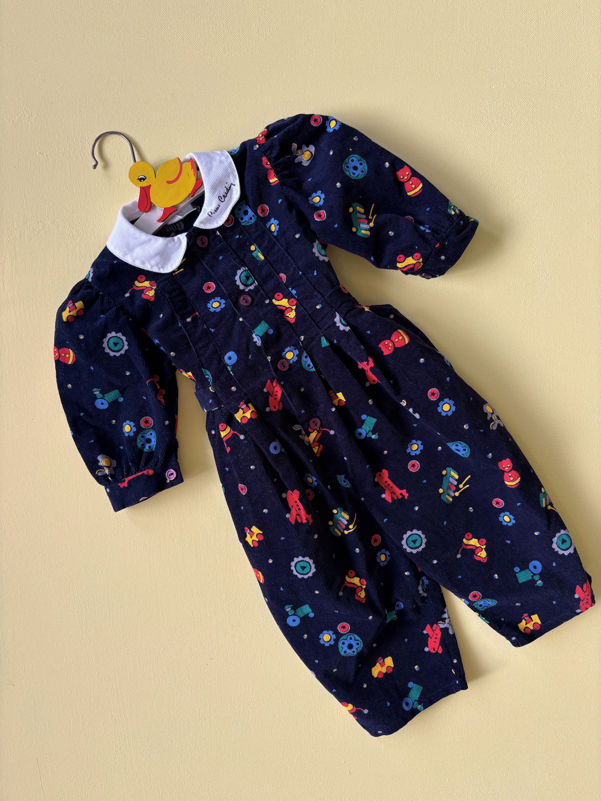 Beautiful jumpsuit in soft corduroy with playful motifs and Peter Pan collar. Made in France